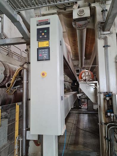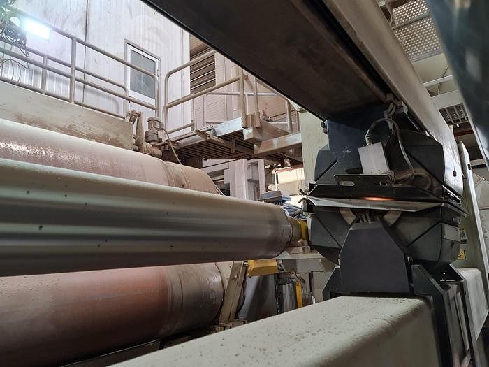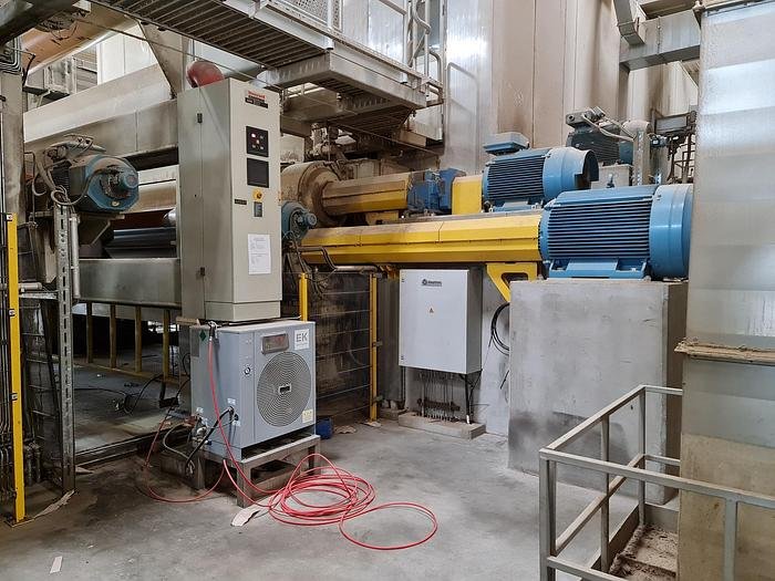 Power installed – 185 kw top roll + 360 kw bottom roll + 480.84 kw auxiliaries (Hydraulic pump - 2 x 5.5 kw; Doctor blade oscillator - 2 x 0.37 kw; Heating - 3 x 2 kw; Hydraulic cylinder pump - 2 x 22 kw; Hydraulic cylinder bypass - 2.2 kw; Lubrication pump – 2 x 2.2 kw; Cooling rotary joint – 0.75 kw; Heating bar – 8 x 50 kw; Heating circulation pump – 11 kw; Heating high pressure filling pump – 0.75 kw).